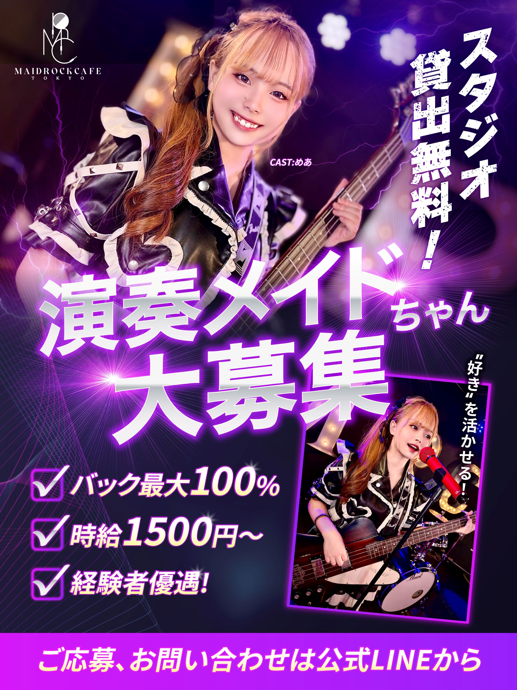 楽器(ギター・ベース・ドラム・ボーカル含む)の演奏が出来ない、自信の無い方はキラキラコンカフェ嬢として是非当店を盛り上げてください!(基本的にはステージでの演奏やパフォーマンスはございません)